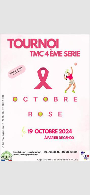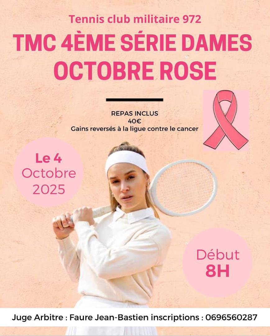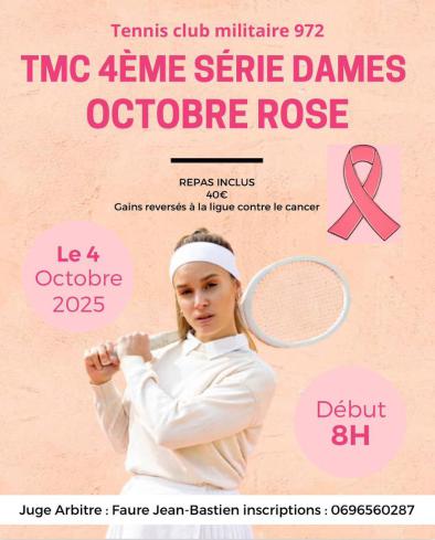 Dans le cadre du mois "d'Octobre rose" dédié à la sensibilisation des femmes au dépistage du cancer du sein, le tennis club militaire organise un Tournoi Multi Chances 4e série, ouvert à toutes les femmes licenciées de non classée à 30/1, le samedi 4 octobre de 08H à 19H.