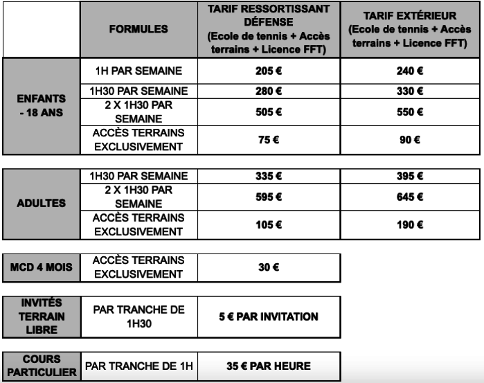 Le coût annuel de l'activité dépend de la formule choisie et du profil de l'adhérent (ressortissant Défense ou extérieur).