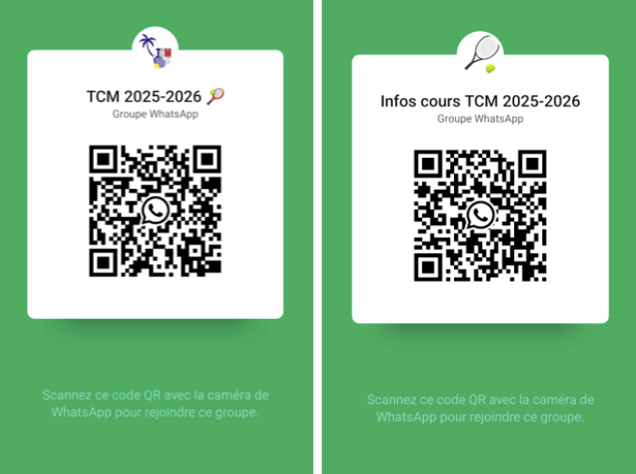 Vous pouvez également rejoindre le groupe WhatsApp "TCM 2025-2026" dédié aux échanges entre adhérents (recherche de partenaires, etc.) et à la diffusion des actualités du club (animations, tournois, etc.).